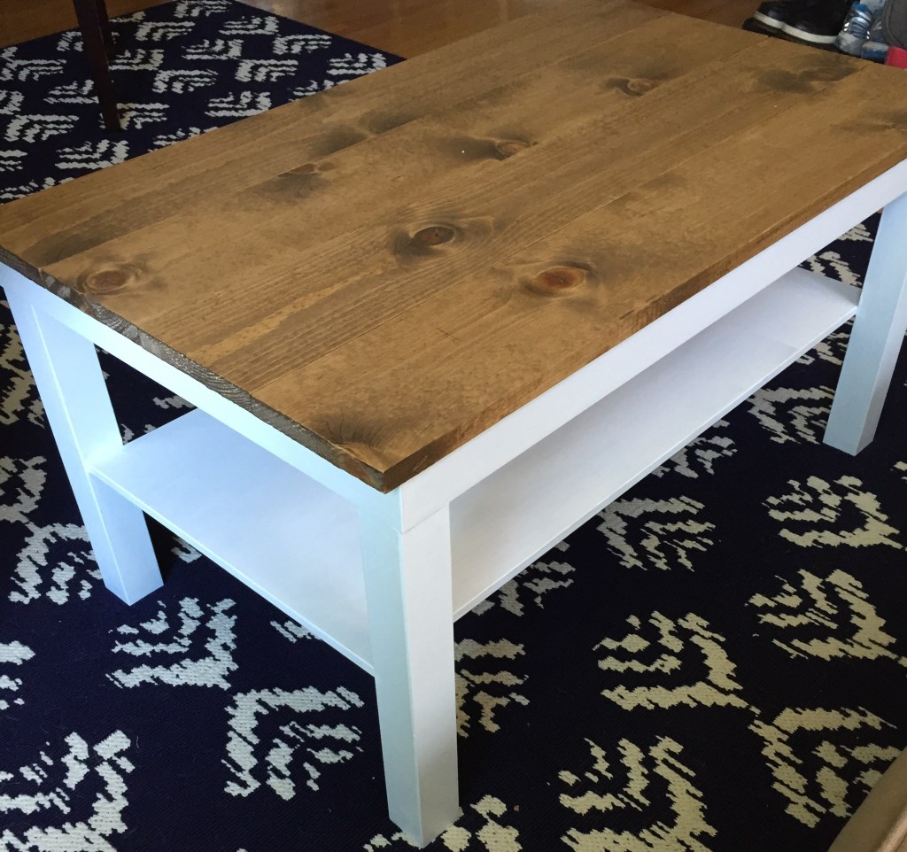 We used to have the ultra-affordable, Lack coffee table from Ikea. Didn’t we all? Unfortunately for us, our dog, Runner, sheds a lot. Black/brown is an awful color choice for the room she is in the most; that and it no longer goes with our color scheme.