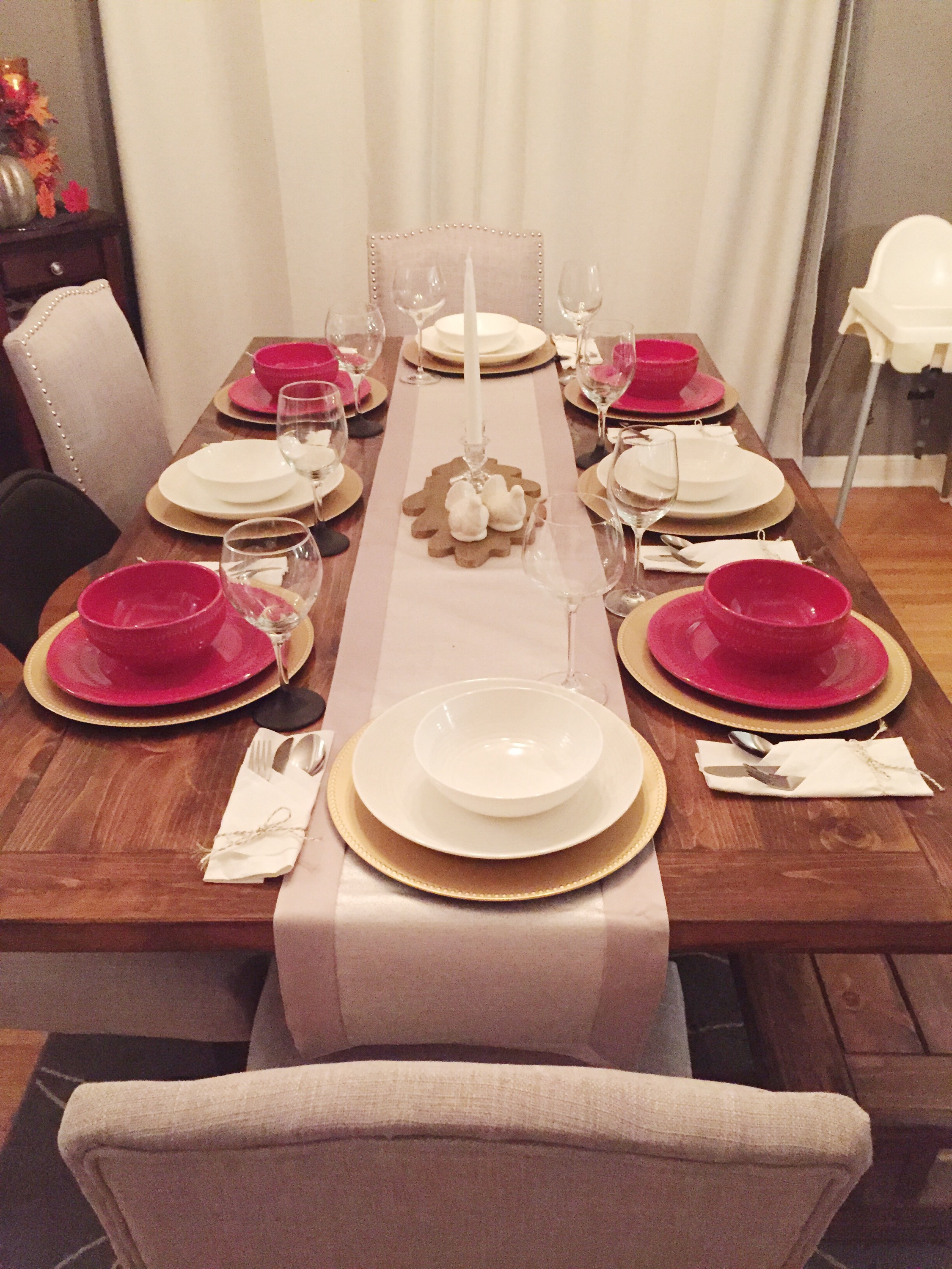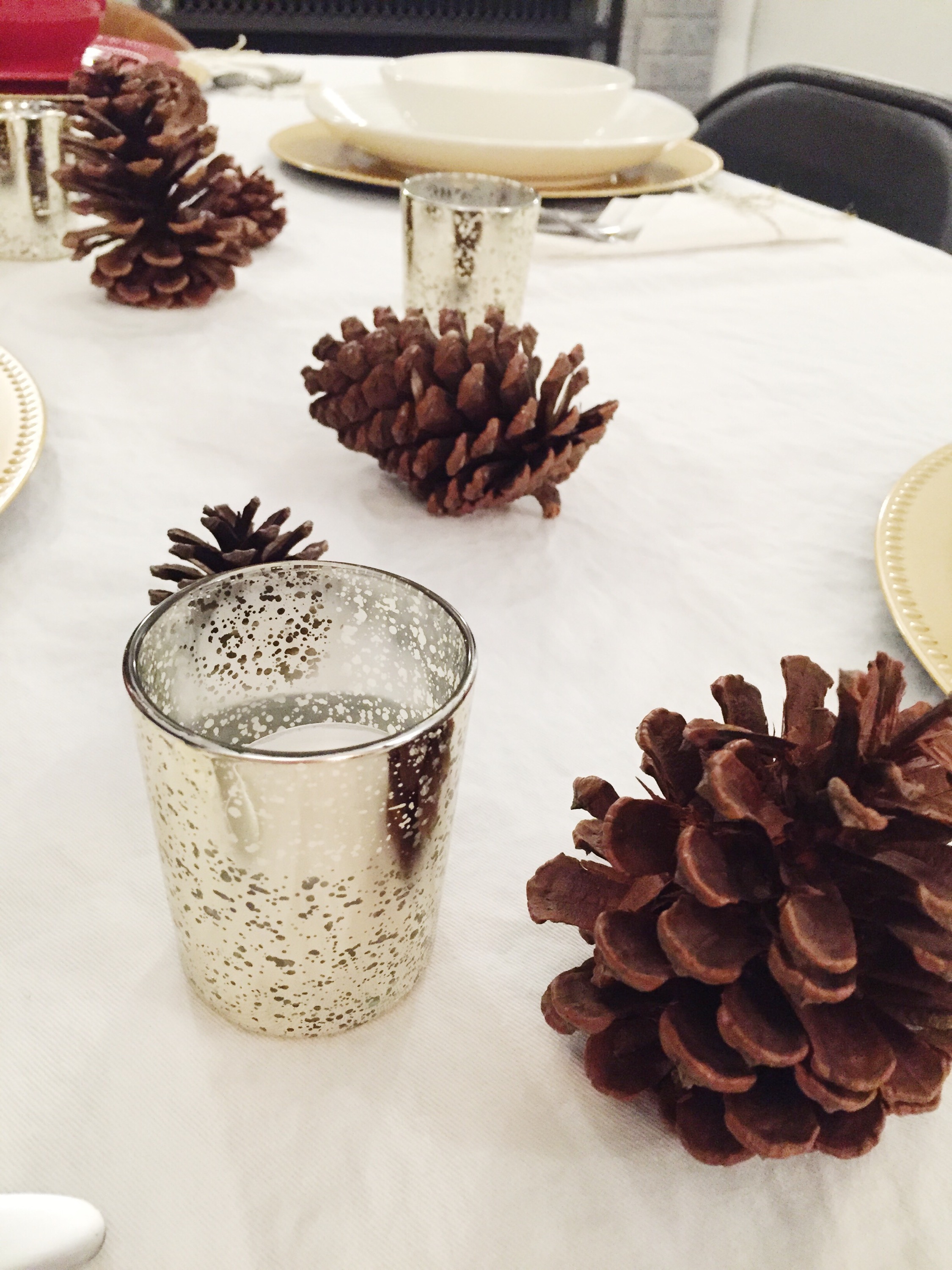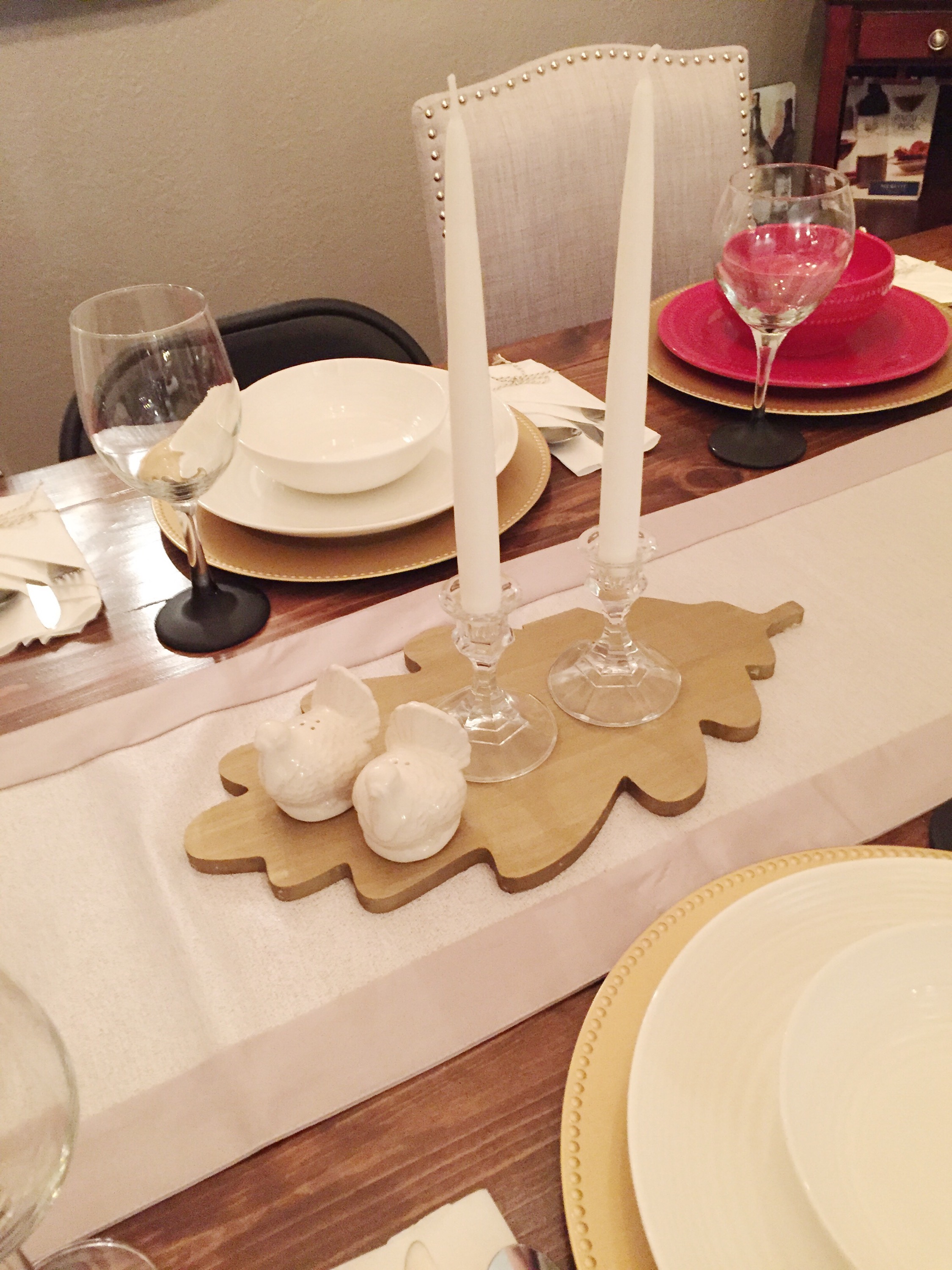 Tip #4: If possible, don’t wait until the last minute. I made that mistake with my centerpieces, but I made it work. When I went shopping, all fall accents were gone and I was only able to find Christmas pieces. I was lucky enough to find a wooden leaf on clearance at Target that I painted gold and worked with what I had: crystal candle holders, gold votives, pine cones (bought on clearance after Christmas last year!) and some turkey salt and pepper shakers we’ve had for a few years.