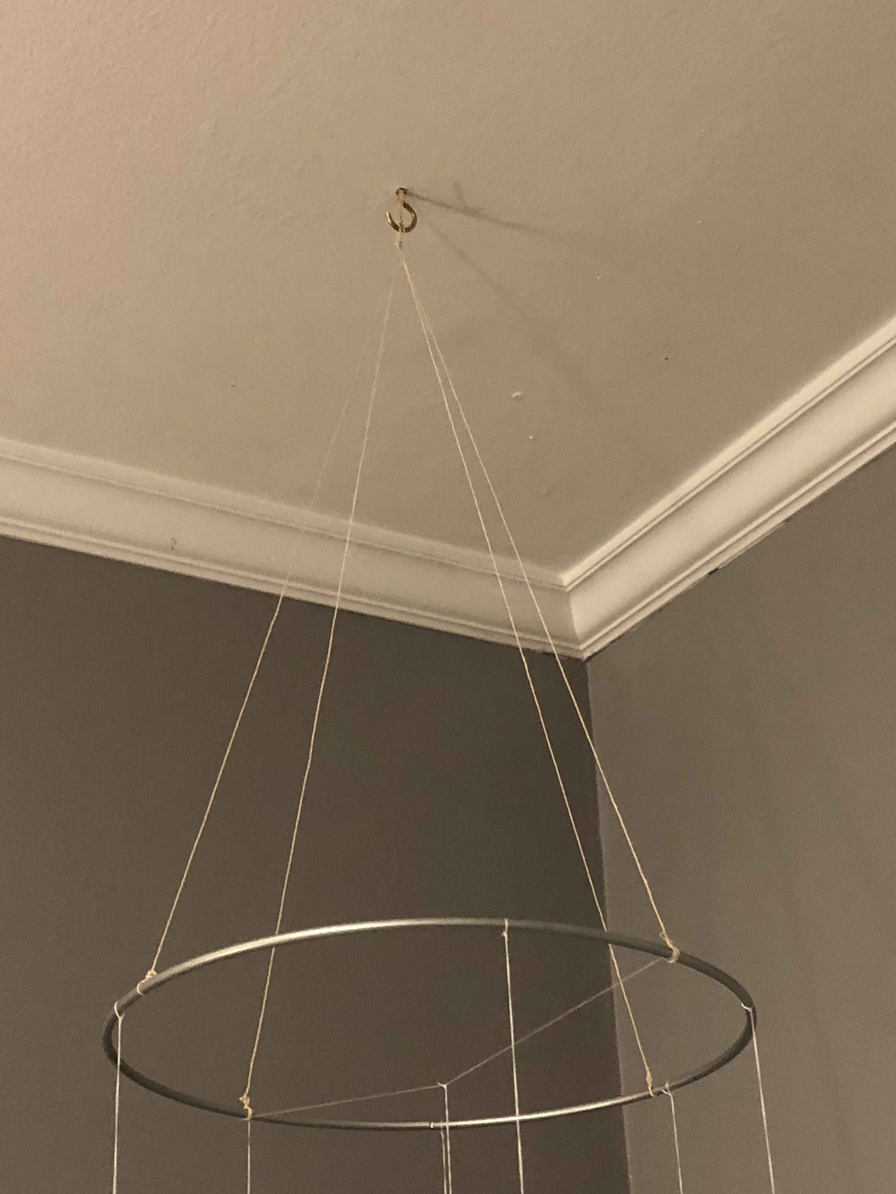 - Attach string to your ring to suspend it from the ceiling. I used two approximately 24″ strands tied on each end and balanced in the center.